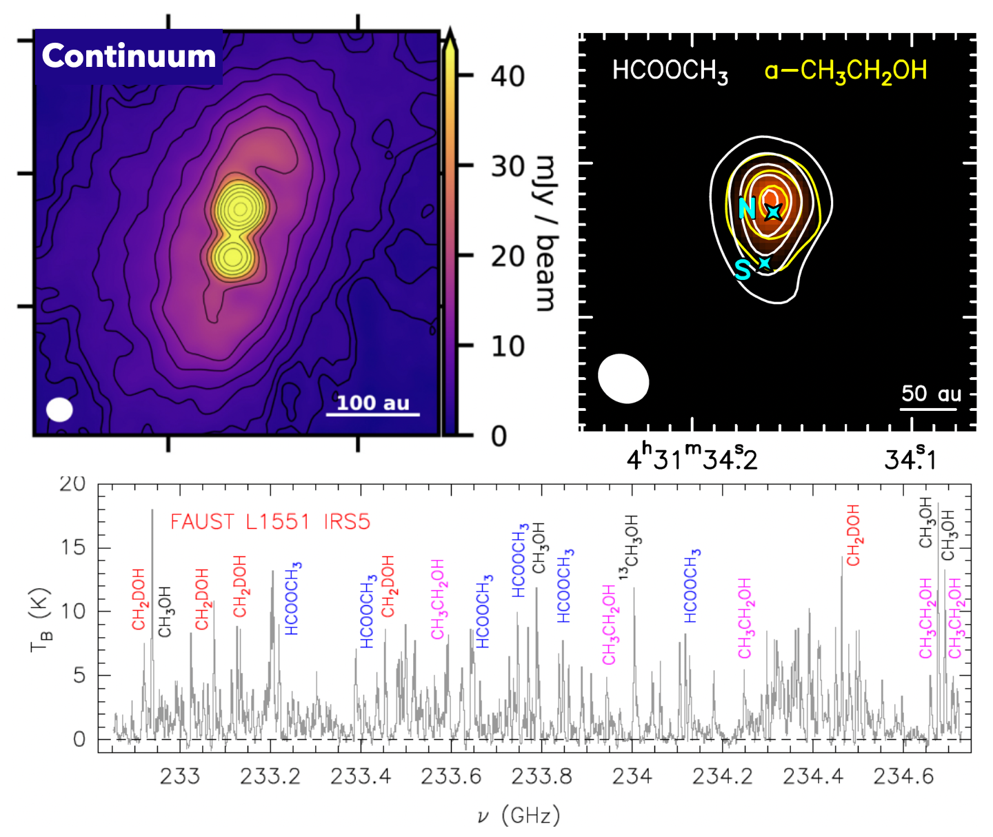 During the thesis, the student will investigate the spatial distribution and physical properties of iCOMs in young protostellar discs. One or more selected species will be analysed leveraging observations from the FAUST ALMA Large Program (Fifty AU STudy of the chemistry in the disk/envelope systems of Solar-like protostars; Codella et al. 2021), as well as from individual ALMA proposals. The observed abundance ratios will be compared with those measured in other protostellar discs and solar system comets, which are the relics of the formation of our Solar System. This comparison will be used to test the inheritance scenario: the hypothesis that complex molecular species, crucial for the origins of life, are, at least partially, inherited from the earliest evolutionary stages. The student will also participate to the activities of the iSEEDs (AstrochemIcal Study of Early Embedded Disks) project (www.iseeds.inaf.it/).