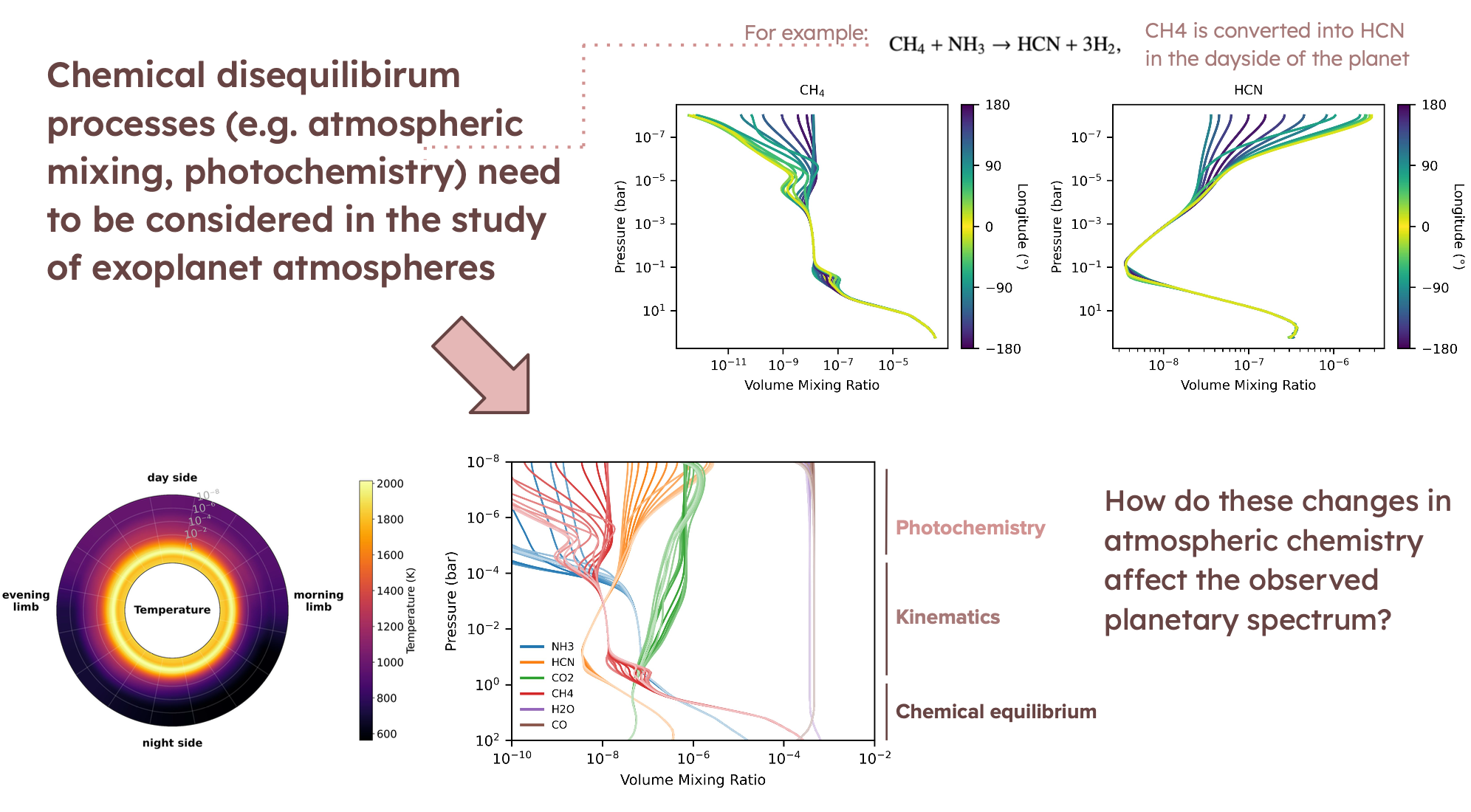 Recent studies have shown that photochemistry and atmospheric mixing play a crucial role in shaping the composition of these planets’ atmospheres, leading to observable departures from chemical equilibrium predictions. Yet, most current models still rely on simplified one-dimensional equilibrium chemistry, even though observations reveal strong spatial inhomogeneities in temperature and composition. To address this, the proposed project aims to identify spectral fingerprints of disequilibrium chemistry in the atmosphere of HD 209458 b by leveraging a state-of-the-art grid of two-dimensional photochemical transport models. These simulations provide detailed maps of temperature, wind patterns, and chemical abundances as a function of longitude, capturing the interplay between stellar irradiation and large-scale atmospheric circulation.