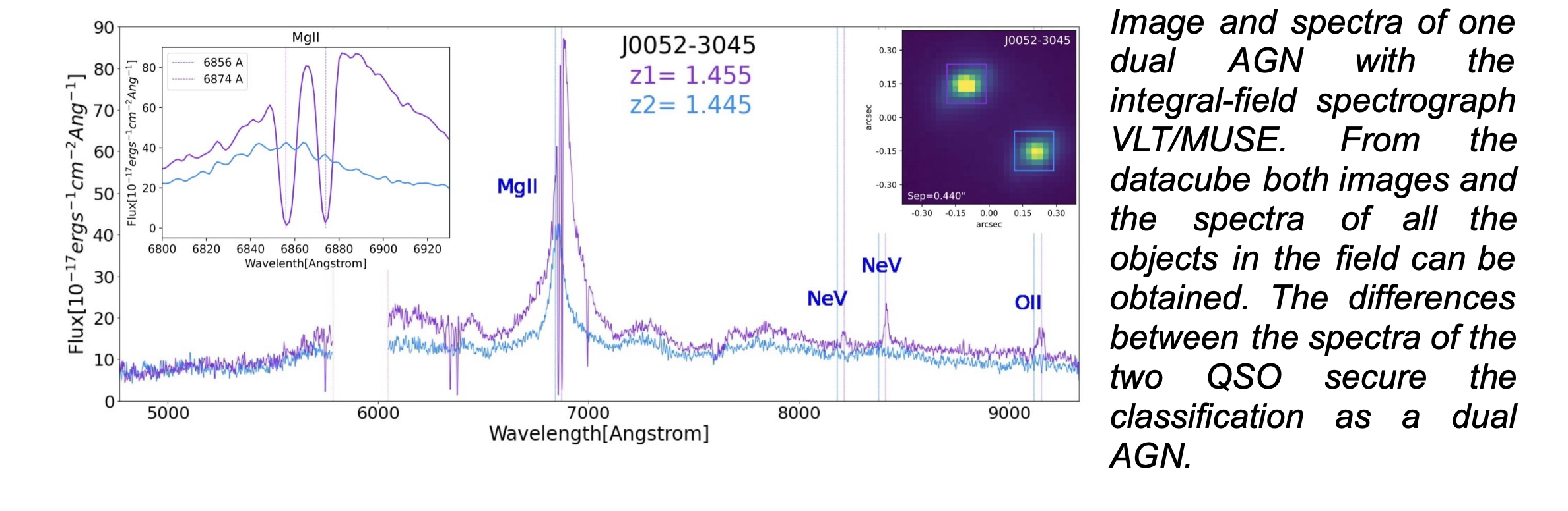 We are conducting a large observational campaign to discover and study a large number of distant (z>0.5) dual AGN with small separations (between 1 and 7 kpc), and study their properties. We are using the most powerful telescopes and instrumentations, including 8m-class, ground based, adaptive-optics assisted telescopes with integral-field spectrographs (VLT/MUSE, VLT/ERIS, Keck/OSIRIS, and ALMA) and instruments from the space (HST/STIS, JWST/NIRspec). In particular, we are using data from an on-going ESO Large program with VLT/MUSE (see figure), and guaranteed time observations with VLT/ERIS. Dual AGN candidates are selected using the ESA satellites Gaia and Euclid through two new revolutionary techniques developed by our group, also using machine learning analysis of images. This allowed us to discover and characterize about 75% of all the confirmed dual AGN at close separation at between redshift 0.5 and 3.5. Machine-learning techniques are used for several of the required tasks. In-person observations at various telescopes, mainly VLT at Paranal, NTT at La Silla, and TNG at La Palma, are possible and encouraged.