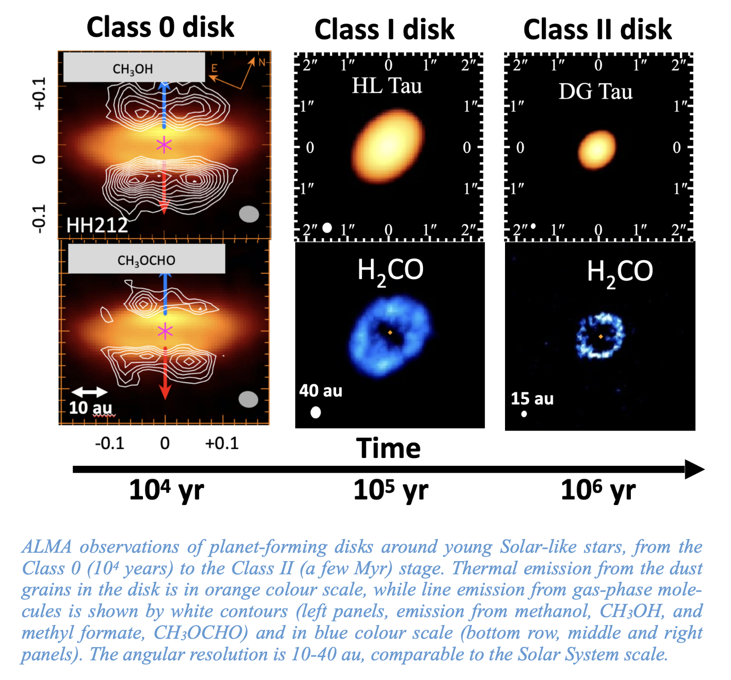 The master student will analyse observations taken with state-of-the-art interferometers working at millimetre and centimetre wavelengths, such as ALMA and VLA, to detect the emission from gaseous molecules and dust grains in planet-forming disks at different stages of evolution (from 104 years to a few Myr) down to scales of a few au, i.e. comparable to the size of our Solar System (50 au) (see as an example the figure below).